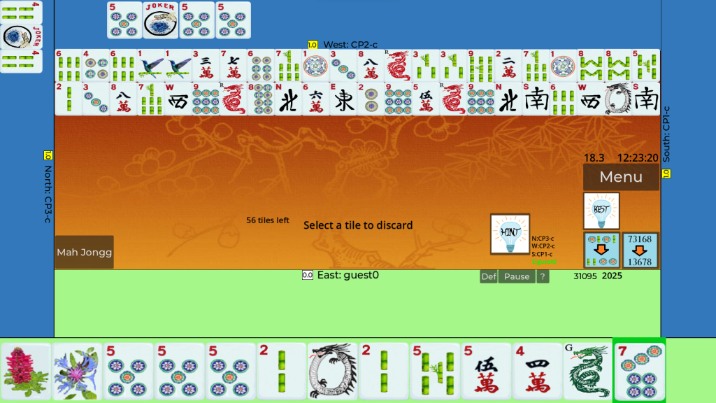 Dive into the captivating world of American Mah Jongg! Whether you’re a pro or beginner, our Mah Jongg game will keep you coming back for more. Always free, no limits or ads. Play multiple skill level bots or real players. Gives best hands, skill feedback, and card completion history. Our secrets of MahJongg page gives hints on best play including Easiest Hands and American Mah Jongg basics. You can customize tiles, cards, game settings, and help features. We keep track of record scores and impressive wins. Our beautiful custom tiles and graphical interface are shown below.