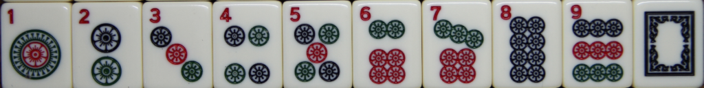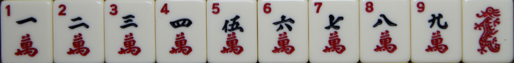 The 3 suits each have 10 tiles, the numbers 1 to 9 plus a dragon. The green dragon goes with bams, red dragon with craks, and white dragon (also called soap) goes with dots. To remember this: the main color in the bam tiles is green, the main color in the crak tiles is red, and the white dragon looks like a big dot. The white dragon can also be used as zero with any suit. There are 4 identical tiles of each number and 4 dragons in each suit.