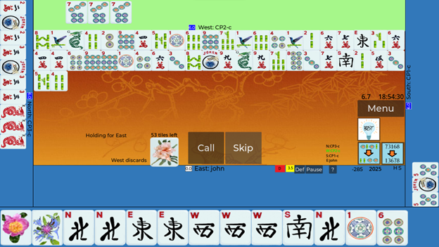 The last discarded tile and who discarded it are shown at the lower left side of the white discard area in Figure 7 (Table Type “Table 1”). The number of tiles left (in the wall to draw) is shown to the right of the discarded tile. Depending on the “Auto Hold” setting, the primary player may have a limited time to call the discarded tile before the next player draws a tile. This is how a regular Mah Jongg game is played. If you don’t call the tile before the next player draws and places the tile on their rack, then you can’t call the tile. The “Auto Hold” option can be used to make the game easier than normal by automatically selecting hold when you can call a tile and, optionally, only when needed for the hand you are trying to make. Otherwise, the time to “Hold” or “Call” is determined by the setup parameter, “Discard Pause.” The hold time left is counted down next to the “Hold” button. If Hold is set by either “Auto Hold” or pressing the “Hold” button, then “MahJongg” and/or “Call” and “Skip” buttons will be shown.