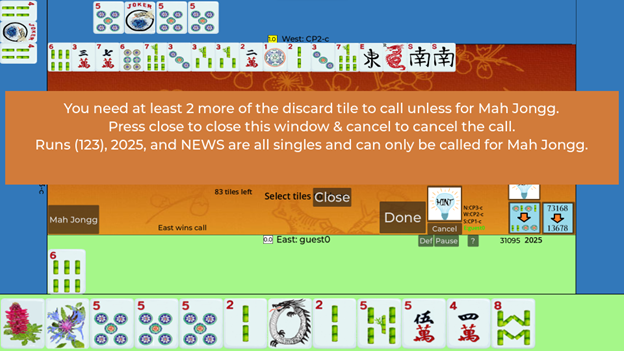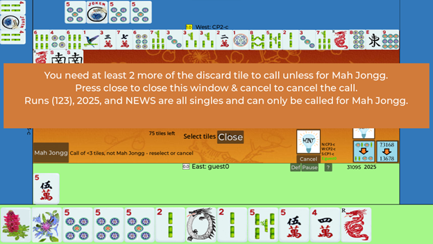 If you can select a tile, but it is still not a valid call (single or pair not for Mah Jongg), then you will also get the warning message shown in Figure 7b (right of the Mah Jongg button).