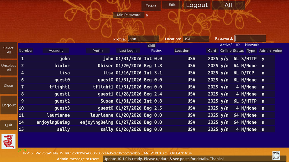 App Updates: The app does not automatically update itself; however, the administrator can set the latest version number on the web site so users are notified if a newer version is available. If available, the new version number is shown above the logo at the lower left of the lobby. An administrator can also post a message to all users using the bottom of the Figure D5 display. The message is displayed in the lobby when a user logs in. If necessary, the administrator can require users to update above a specific version before being allowed to play. A message can be sent to the chat window of players that go directly to a game indicating they need to upgrade.