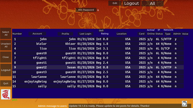 JLMahJongg game administration uses a version of the Player Sets and Data display. A non-administration version of this display is used to log in or out of the game. Administrators control who has game access and user’s initial account information. Administrators should password-protect their accounts.